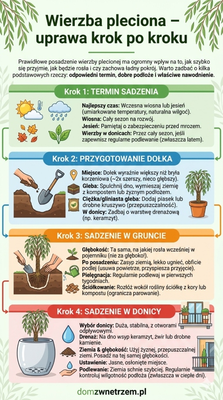 Prawidłowe posadzenie wierzby plecionej ma ogromny wpływ na to, jak szybko się przyjmie, jak będzie rosła i czy zachowa ładny pokrój. Sama roślina nie jest szczególnie trudna w uprawie, ale już na starcie warto zadbać o kilka podstawowych rzeczy: odpowiedni termin, dobre podłoże i właściwe nawodnienie.